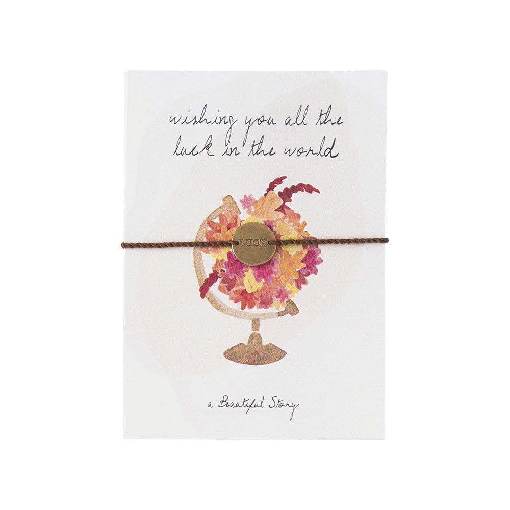 Verschenken Sie ein bisschen Glück: Die Karte zeigt eine einzigartige Darstellung der Weltkugel mit dem Text „wishing you all the luck in the world“. Das Armband aus Baumwoll-Wachsgarn ziert eine handgefertigte Münze mit der Aufschrift „luck“.